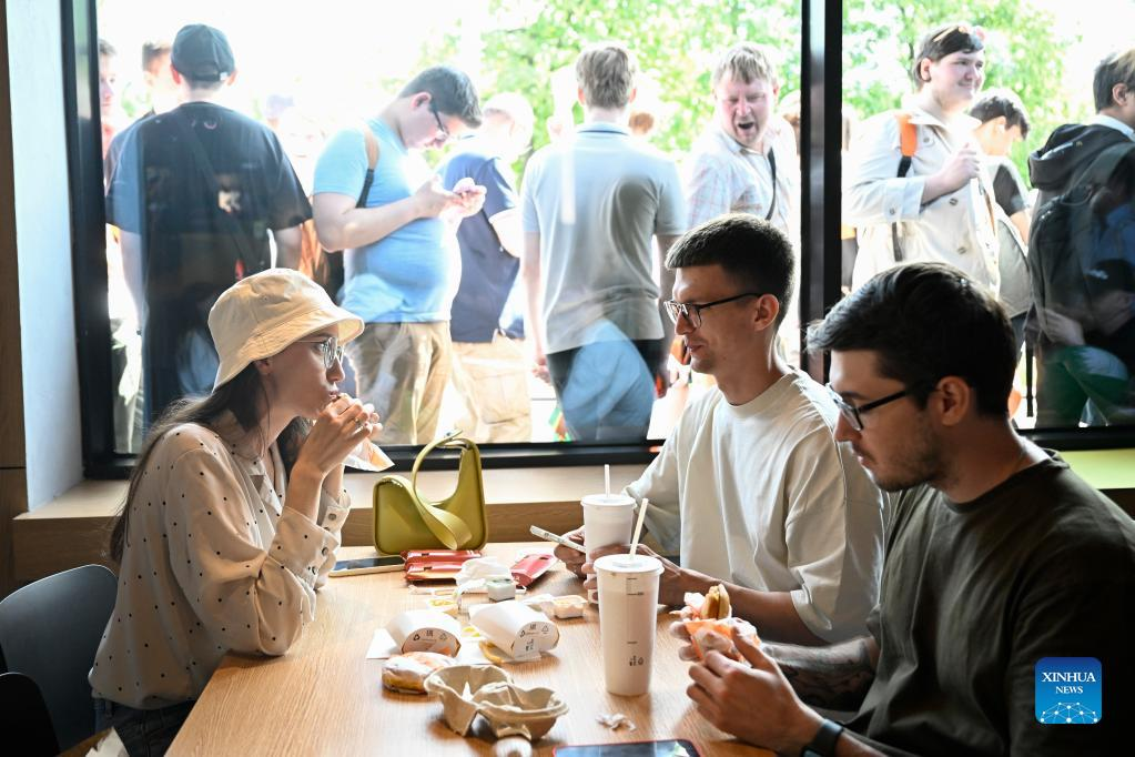 People dine at the newly opened fast food restaurant in a former McDonald's outlet in central Moscow, Russia, on June 12, 2022. The successor to McDonald's in Russia, "Vkusno - i tochka," reopened the first batch of 15 restaurants in Moscow and its suburbs on Sunday, three months after the U.S. fast-food chain ended its business in Russia. (Photo by Alexander Zemlianichenko Jr/Xinhua)