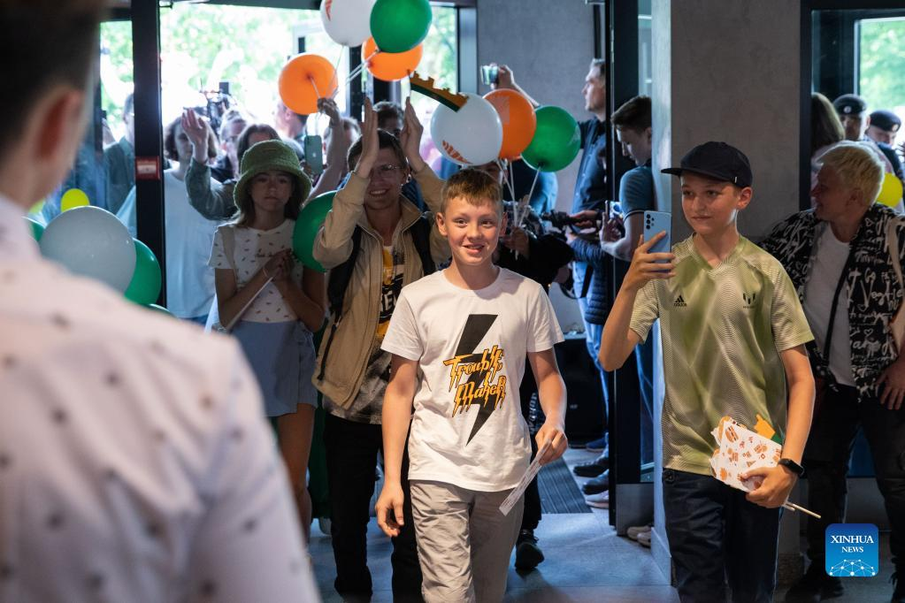 Customers enter the newly opened fast food restaurant in a former McDonald's outlet in central Moscow, Russia, on June 12, 2022. The successor to McDonald's in Russia, "Vkusno - i tochka," reopened the first batch of 15 restaurants in Moscow and its suburbs on Sunday, three months after the U.S. fast-food chain ended its business in Russia. (Xinhua/Bai Xueqi)