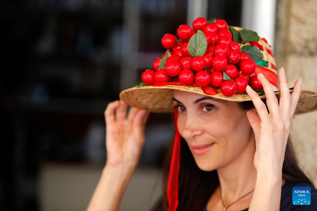 A woman shows a cherry hat at the Hammana Cherry Festival in the village of Hammana, Mount Lebanon Governorate, Lebanon, on June 12, 2022. (Xinhua/Bilal Jawich)