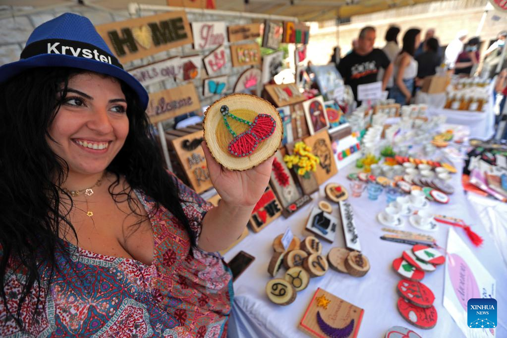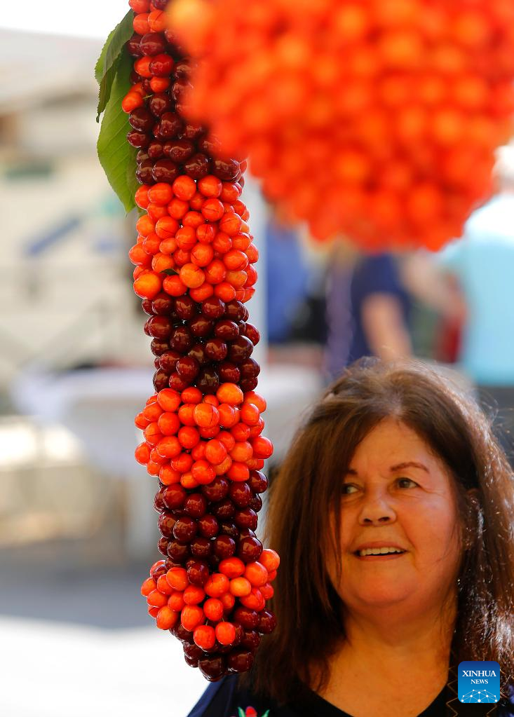 A woman shows a handcraft with cherry design at the Hammana Cherry Festival in the village of Hammana, Mount Lebanon Governorate, Lebanon, on June 12, 2022. (Xinhua/Bilal Jawich)