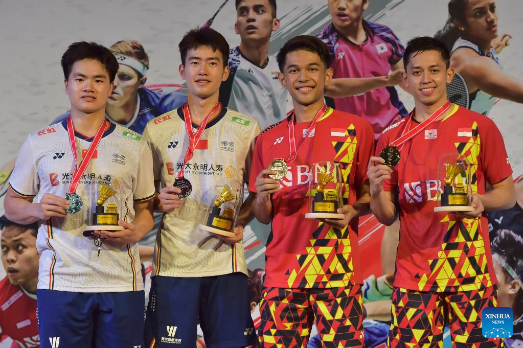 Liang Weikeng (1st L)/Wang Chang (2nd L) of China and Fajar Alfian (2nd R)/Muhammad Rian Ardianto of Indonesia pose for photos during awarding ceremony of the men's doubles final match at Daihatsu Indonesia Masters 2022 at the Istora Senayan sports stadium in Jakarta, Indonesia, on June 12, 2022. (Xinhua/Veri Sanovri)