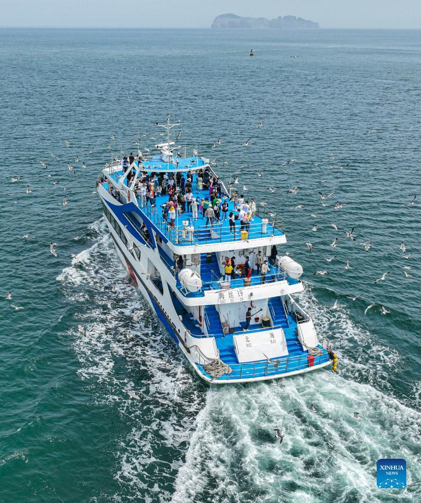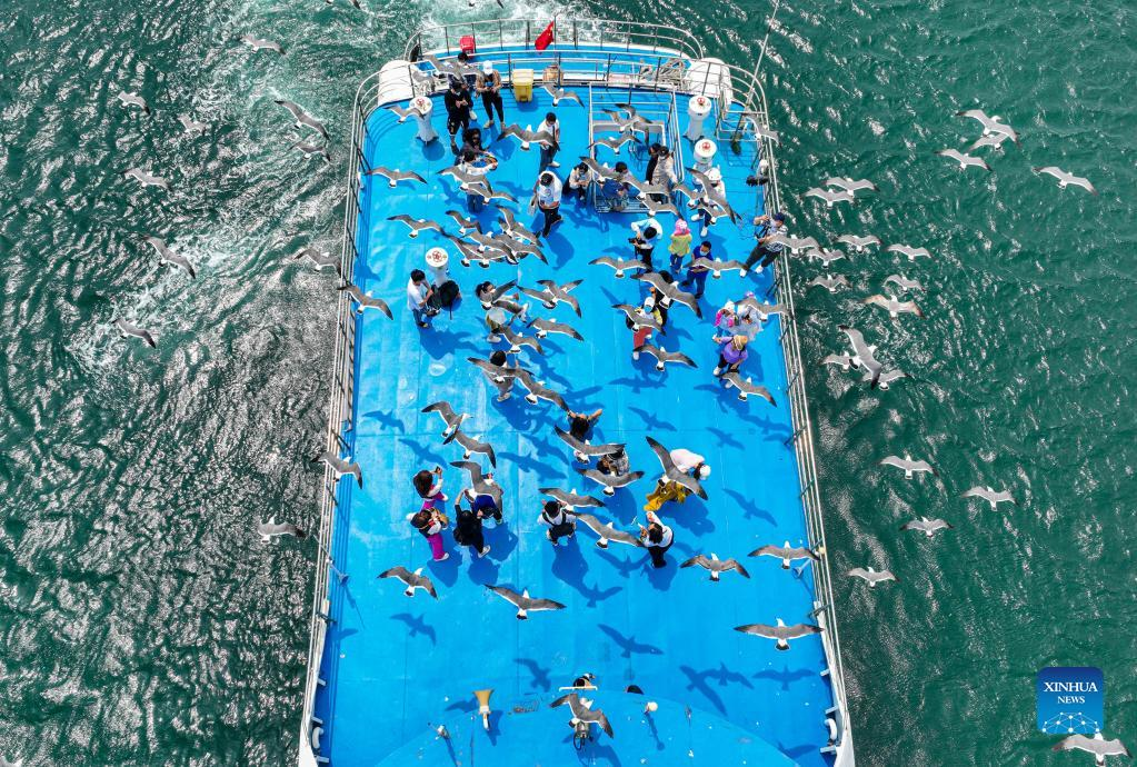 Aerial photo taken on June 12, 2022 shows people feeding a colony of black-tailed gulls in Rongcheng, east China's Shandong Province. (Photo by Li Xinjun/Xinhua)