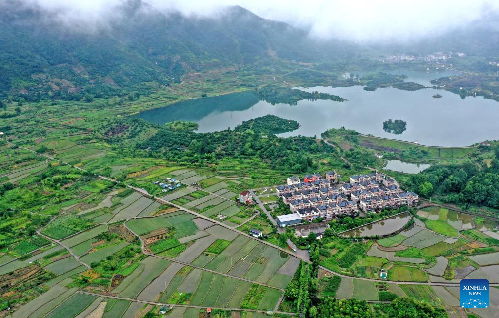 Aerial photo taken on June 13, 2022 shows the view of Xinlian village in Xianju County, east China's Zhejiang Province. Xinlian village, an immigrant village of Dongling Reservoir, is planned, designed and built in a unified style. (Photo by Wang Huabin/Xinhua)