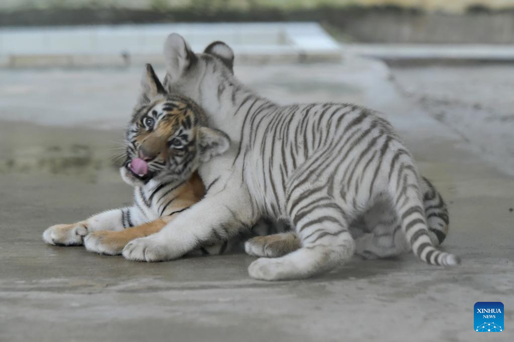 Two Bengal tiger cubs play with each other at the Bangladesh National Zoo in Dhaka, Bangladesh, June 13, 2022.