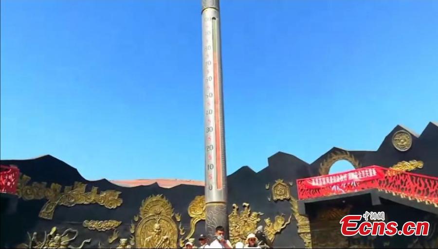 Tourist poses for photo by a giant thermometer at the foot of the Huoyan (Flaming) Mountain in Turpan Basin, northwest China's Xinjiang Uyghur Autonomous Region, June 13, 2022. (Photo: China News Service/Chen Xuemin)