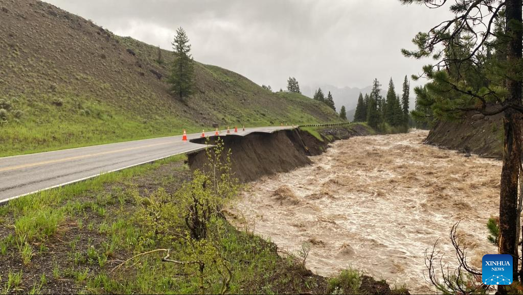 Photo released by U.S. National Park Service on June 13, 2022 shows the Lamar River eroding the Yellowstone National Park's Northeast Entrance Road, the United States. All entrances to the Yellowstone National Park, one of the largest and best-known national parks in the United States, have been closed temporarily due to heavy flooding, rockslides, and extremely hazardous conditions, authorities said. (U.S. National Park Service/Handout via Xinhua)