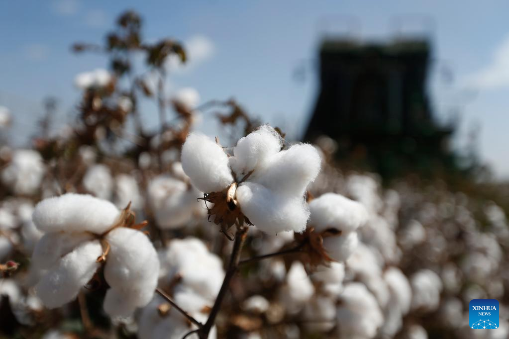 A machine collects cotton at Santa Colomba farm in Bahia state, Brazil, June 14, 2022. Brazil is one of the world's leading cotton producers and exporters. (Photo by Lucio Tavora/Xinhua)