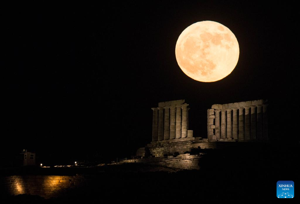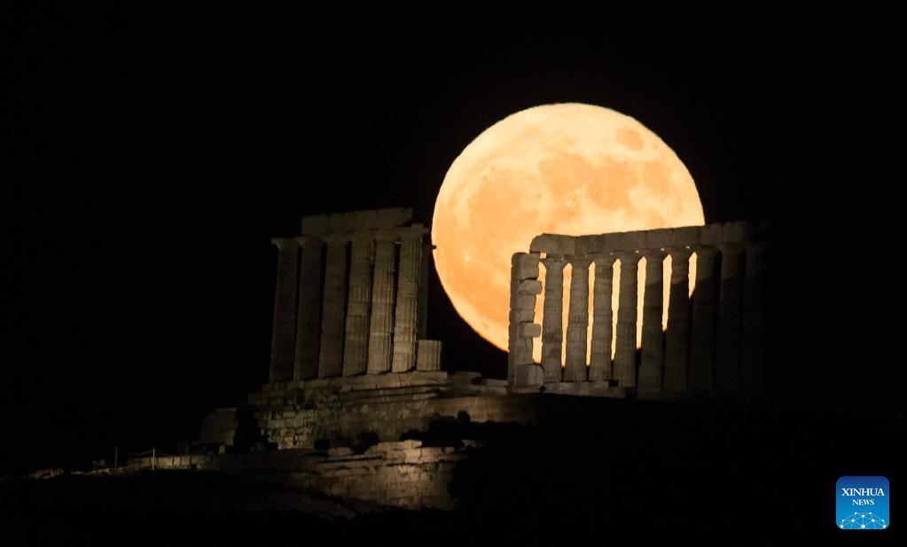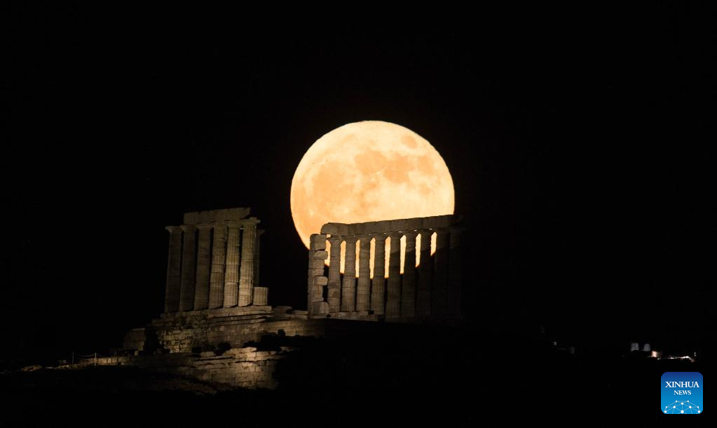 A full moon is seen over the Temple of Poseidon at cape Sounion, some 70 km southeast of Athens, Greece, on June 14, 2022. (Xinhua/Marios Lolos)