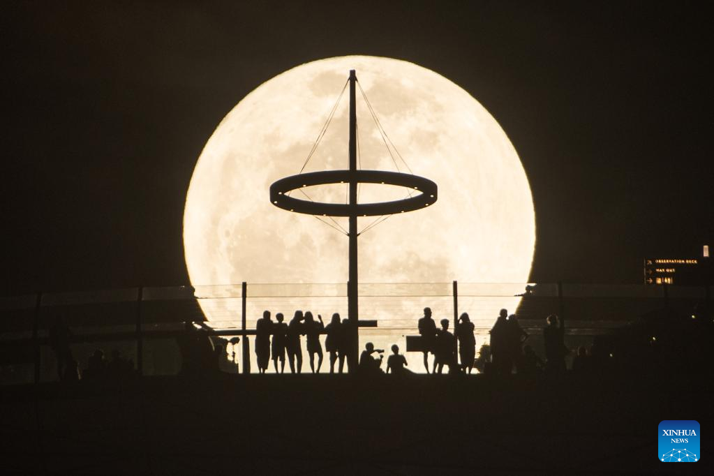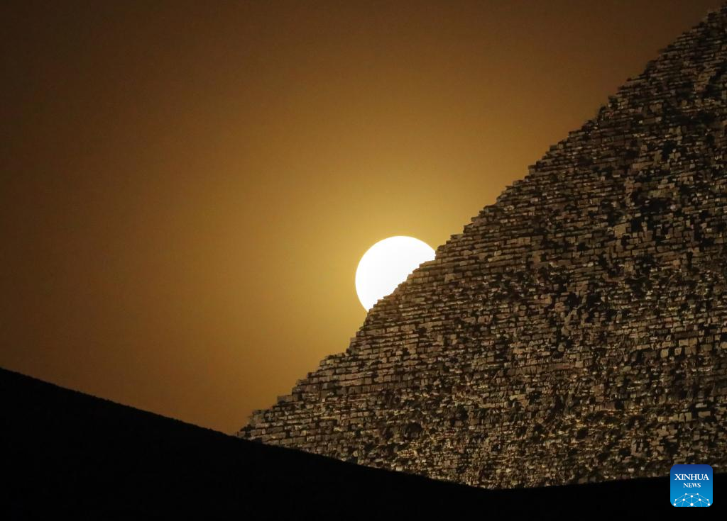 A supermoon is seen near the Great Pyramid of Giza, Egypt, on June 14, 2022. (Xinhua/Sui Xiankai)