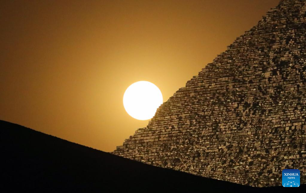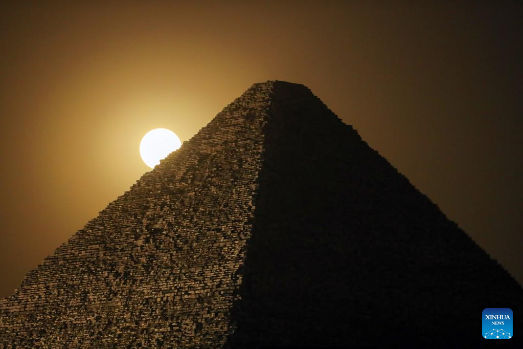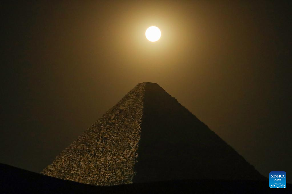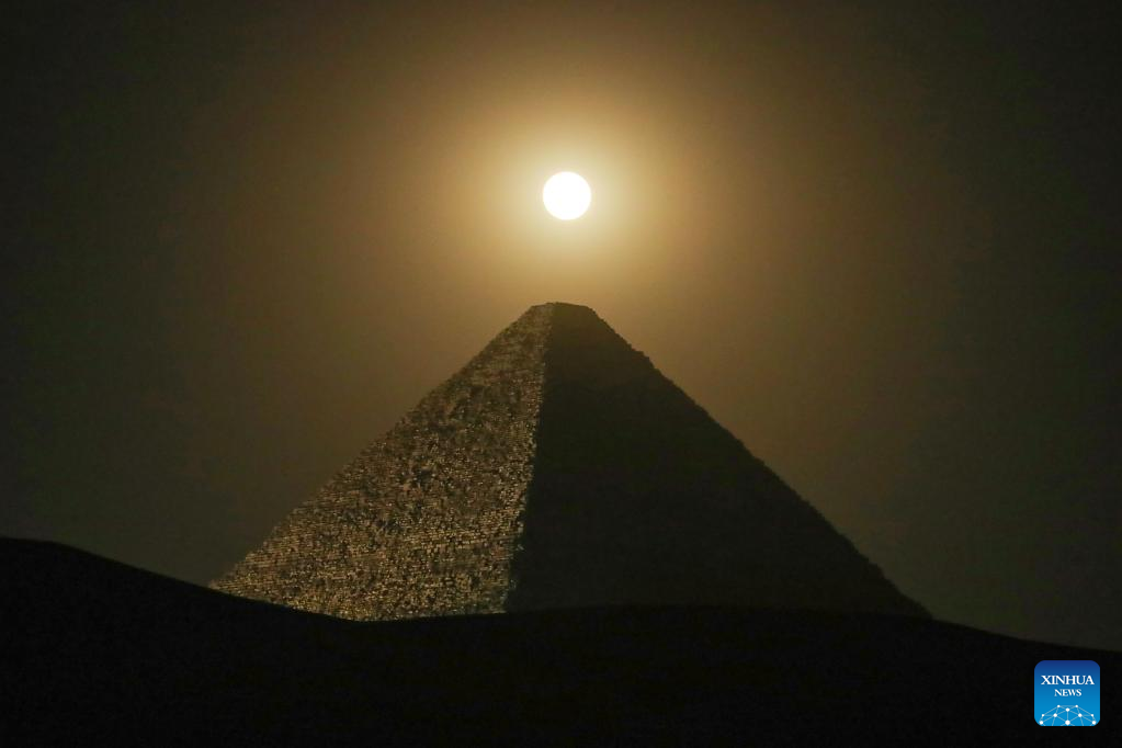 A supermoon is seen in the sky over the Great Pyramid of Giza, Egypt, on June 14, 2022. (Xinhua/Sui Xiankai)