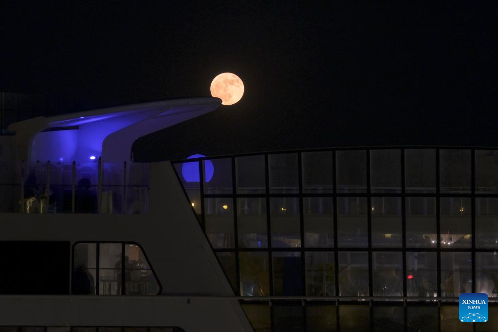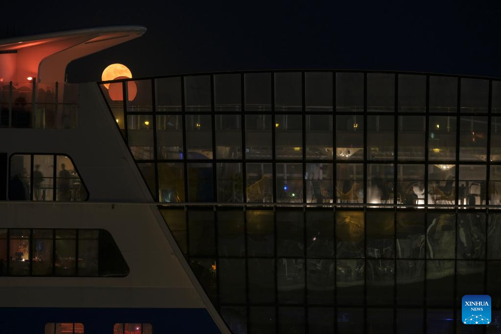Photo taken on June 14, 2022 shows a supermoon partly seen through the glass wall of a cruiser berthed in the Grand Harbor of Valletta in Floriana, Malta. (Photo by Jonathan Borg/Xinhua)