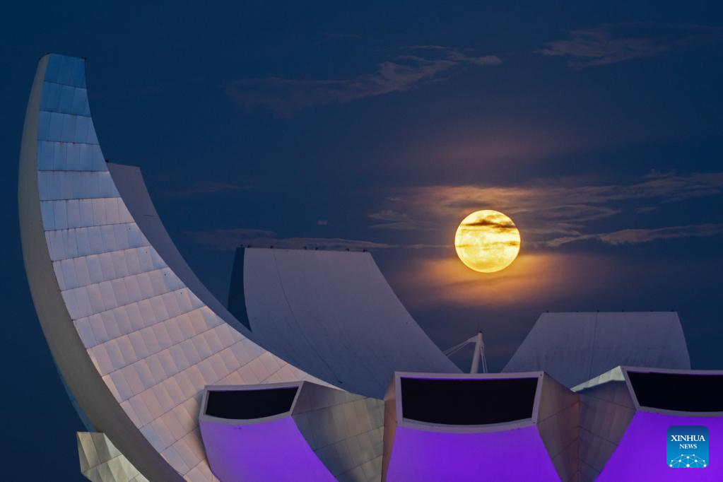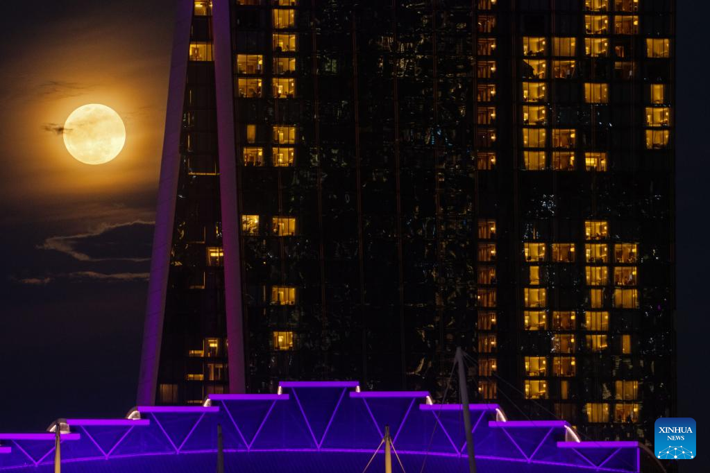 A supermoon is seen in the sky above Singapore's Marina Bay on June 14, 2022. (Photo by Then Chih Wey/Xinhua)