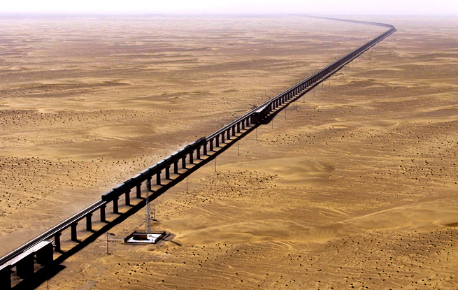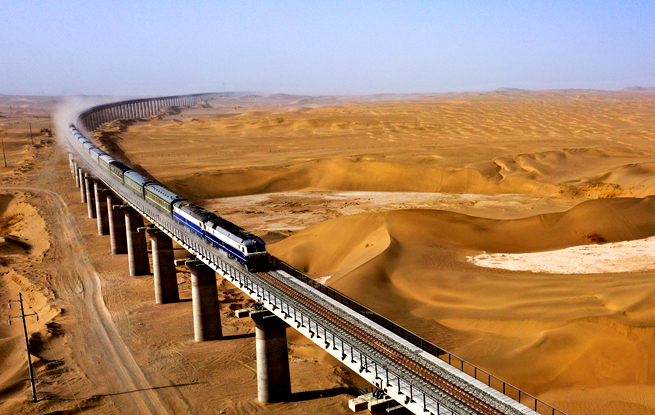 Some 534 kilometers of the railway is located in a sandy area, accounting for 65 percent of the total route. Five bridges were built in the desert with a total length of 49.7 kilometers. About 50 million square meters of grass grids were placed along the railway and 13 million seedlings were planted in order to protect the route and prevent desertification.