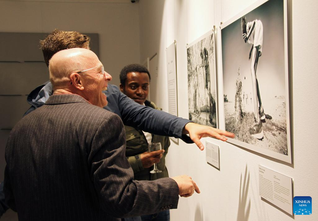 People visit a photo exhibition on Namibia's indigenous games and traditional sports in Windhoek, Namibia, on June 15, 2022. (Photo by Musa C Kaseke/Xinhua)