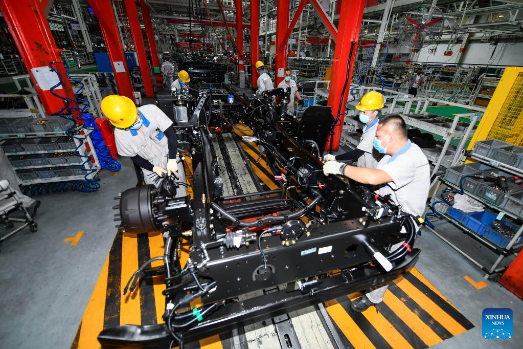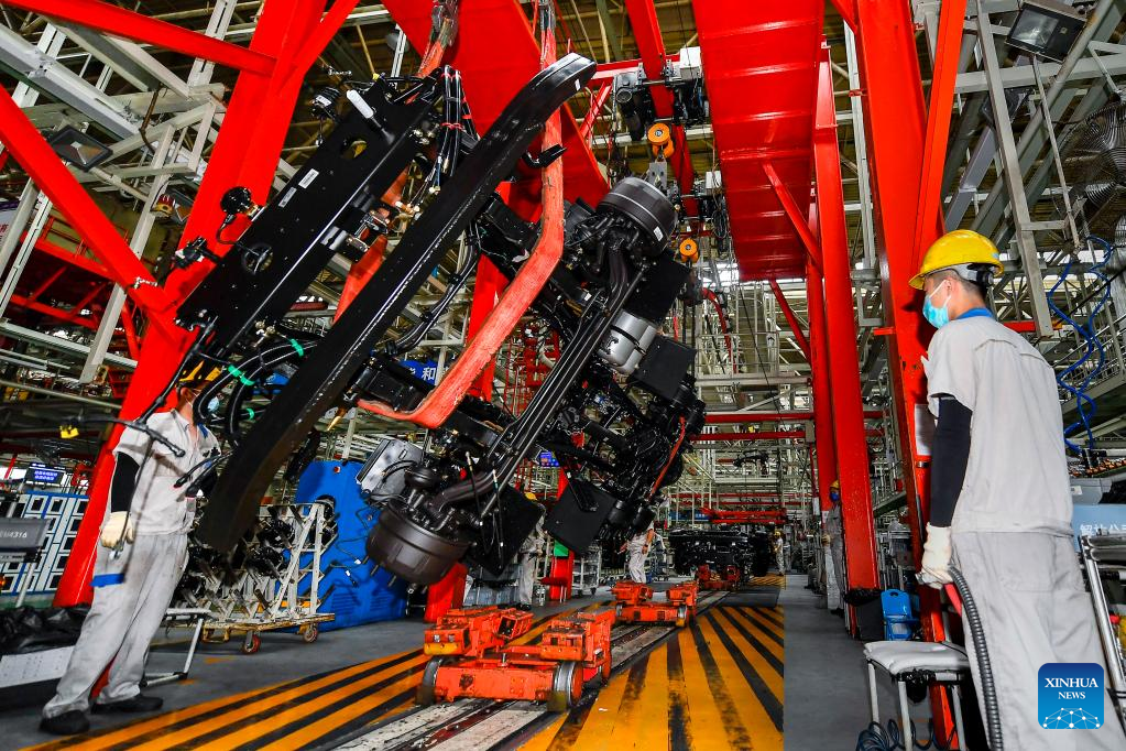 Employees work at an assembly line of FAW Jiefang truck in Changchun, northeast China's Jilin Province, June 15, 2022. (Xinhua/Xu Chang)