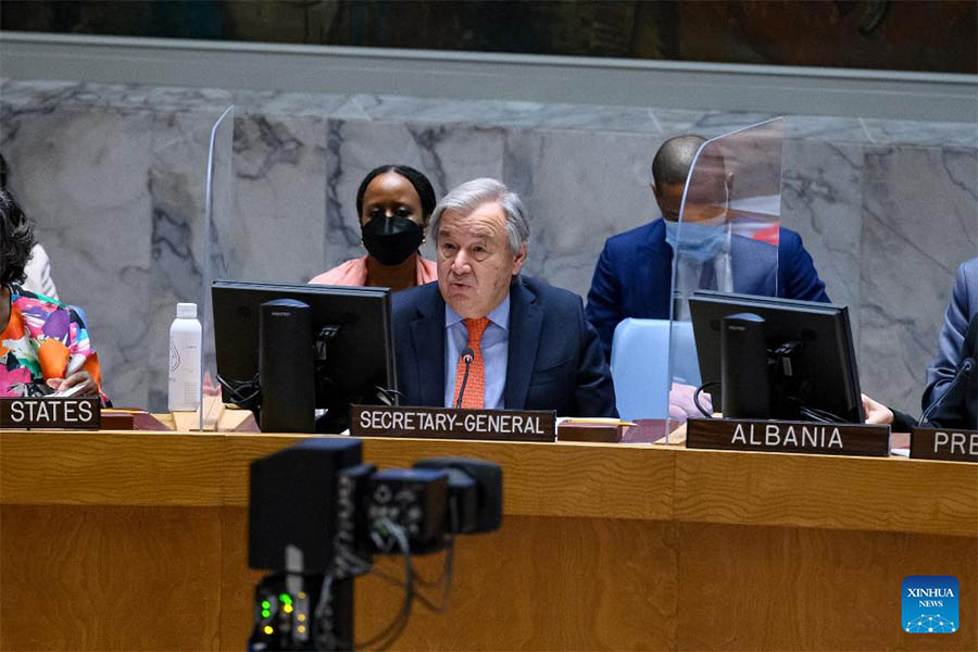 UN Secretary-General Antonio Guterres (C) addresses the Security Council ministerial-level open debate on women, peace and security at the UN Headquarters in New York, June 15, 2022. UN Secretary-General Antonio Guterres on Wednesday urged the international community to protect and promote women's rights amid "proliferating crises." (Loey Felipe/UN Photo/Handout via Xinhua)