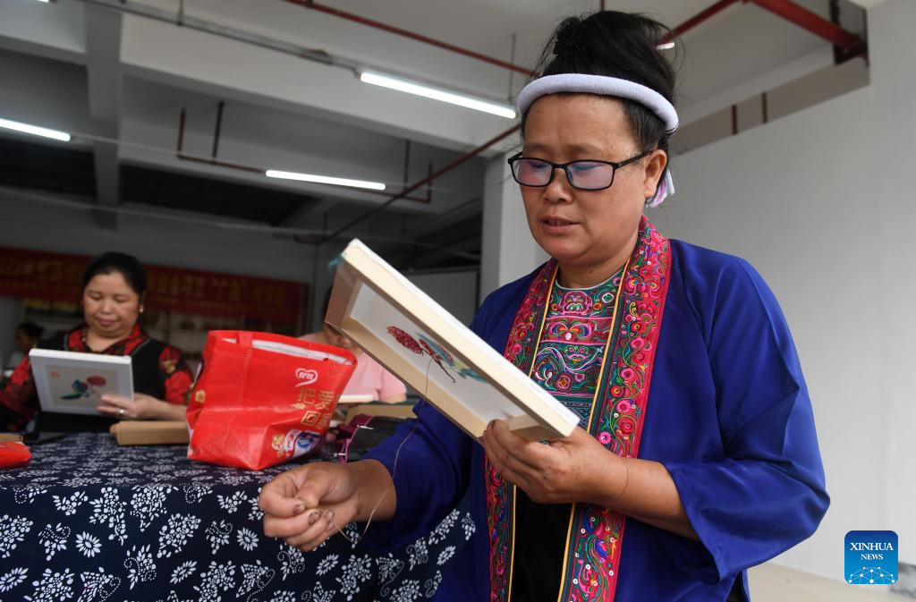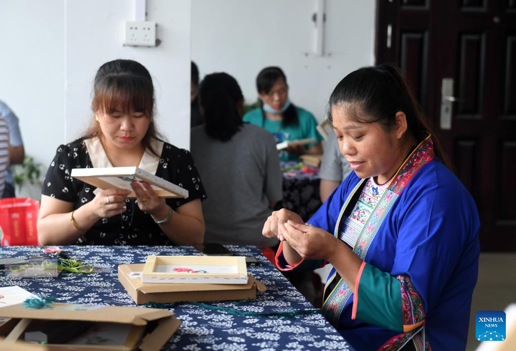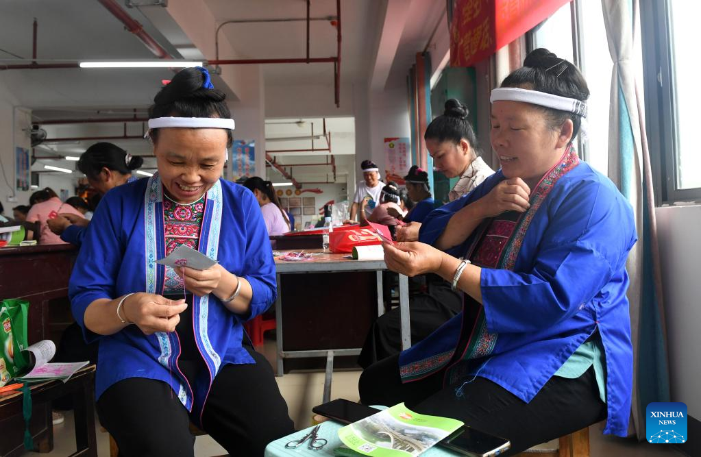 Women learn embroidery at a training class in Guyi Township of Sanjiang Dong Autonomous County, south China's Guangxi Zhuang Autonomous Region, June 16, 2022. Recently local authorities of Sanjiang have organized multiple skill training classes as a way to boost employment and improve locals' incomes. (Xinhua/Lu Boan)