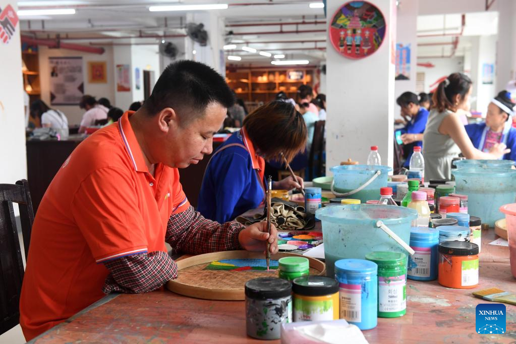 People learn painting at a training class in Guyi Township of Sanjiang Dong Autonomous County, south China's Guangxi Zhuang Autonomous Region, June 16, 2022. Recently local authorities of Sanjiang have organized multiple skill training classes as a way to boost employment and improve locals' incomes. (Xinhua/Lu Boan)