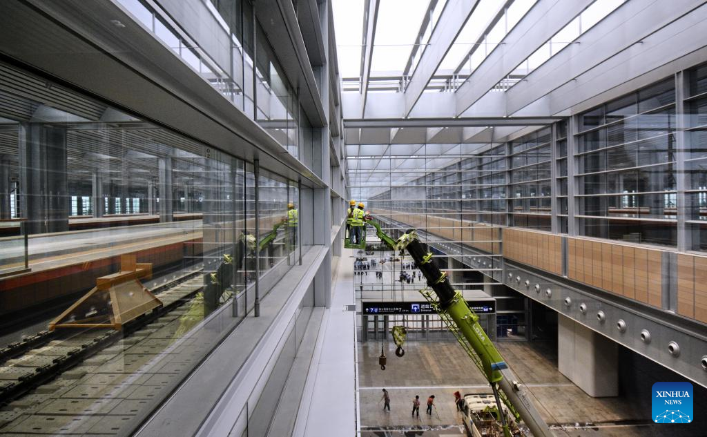 Workers are seen at Beijing Fengtai Railway Station, which will be put into service soon, in Beijing, capital of China, June 16, 2022. (Xinhua/Li Xin)