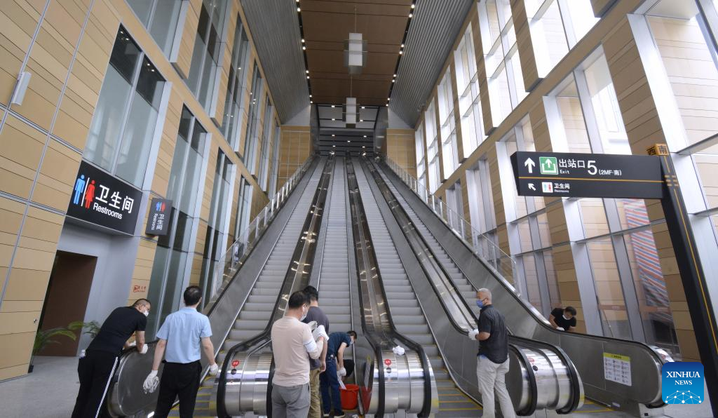 Technicians adjust the escalators to prepare for the operation of Beijing Fengtai Railway Station in Beijing, capital of China, June 16, 2022. (Xinhua/Li Xin)