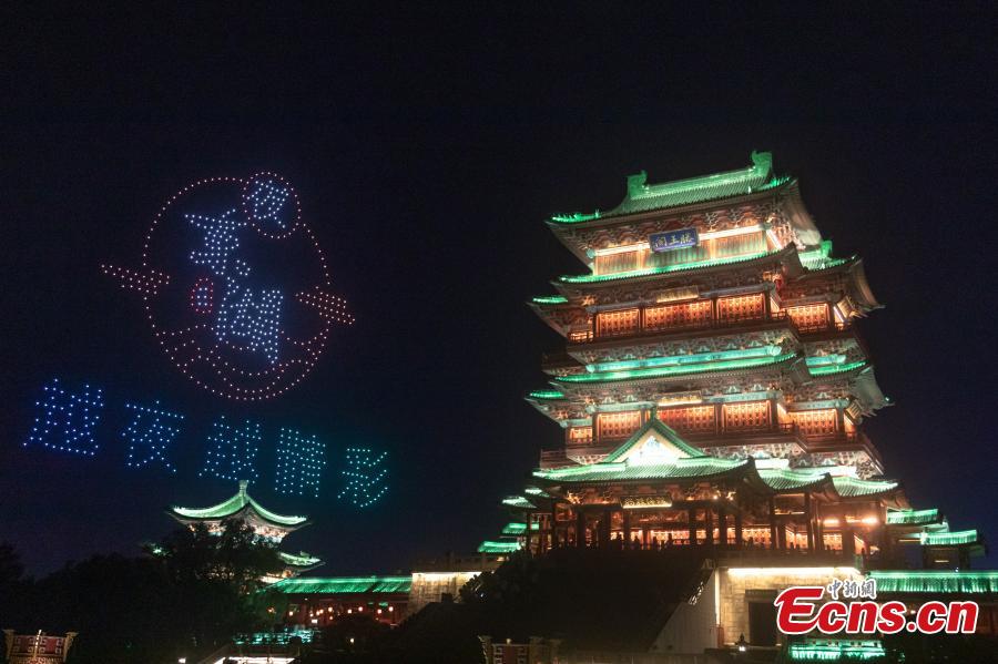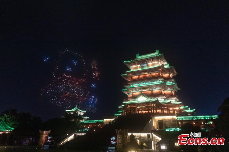 A total of 666 drones light up the sky above Tengwang Pavilion in Nanchang, east China's Jiangxi Province, June 16, 2022. (Photo: China News Service/Liu Lixin)