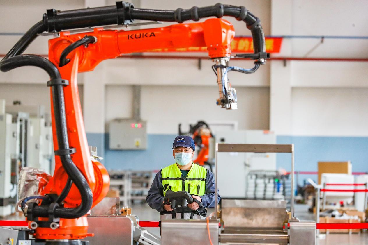 A worker is busy with production at a factory of Weben Smart Manufacturing System (Shanghai) Co., Ltd. in Songjiang district, Shanghai, April 29, 2022. (Photo by Jiang Huihui/People’s Daily Online)