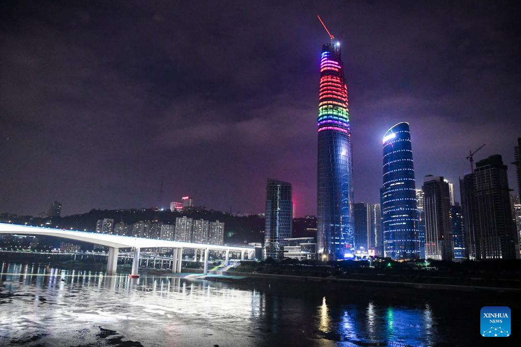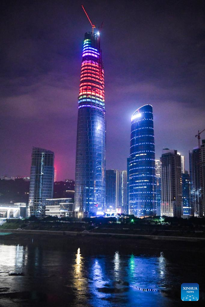 Photo taken on June 17, 2022 shows a night view of the international land-sea center in southwest China's Chongqing Municipality. The 458-meter-high main tower of the international land-sea center, a new skyscraper in Chongqing, was topped out on June 18. (Xinhua/Wang Quanchao)