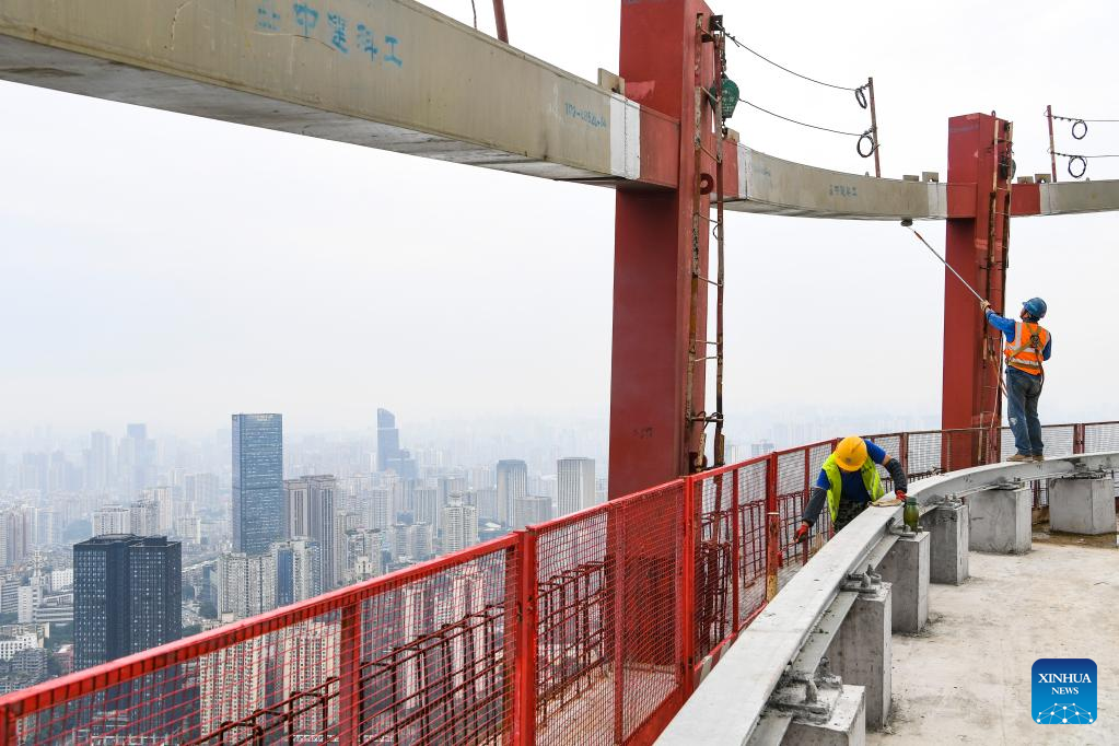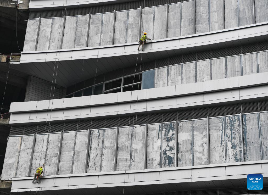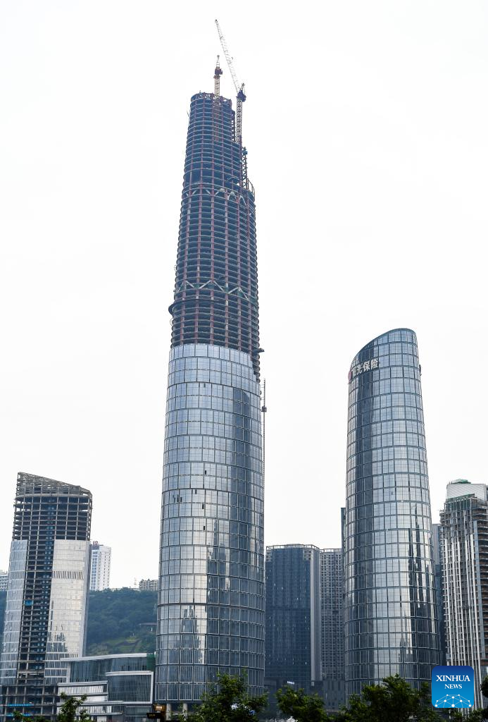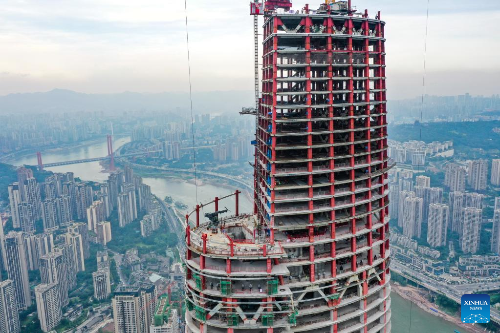 People work on the main tower of the international land-sea center, also known as Chongqing 100, in southwest China's Chongqing Municipality, June 17, 2022. The 458-meter-high main tower of the international land-sea center, a new skyscraper in Chongqing, was topped out on June 18. (Xinhua/Wang Quanchao)