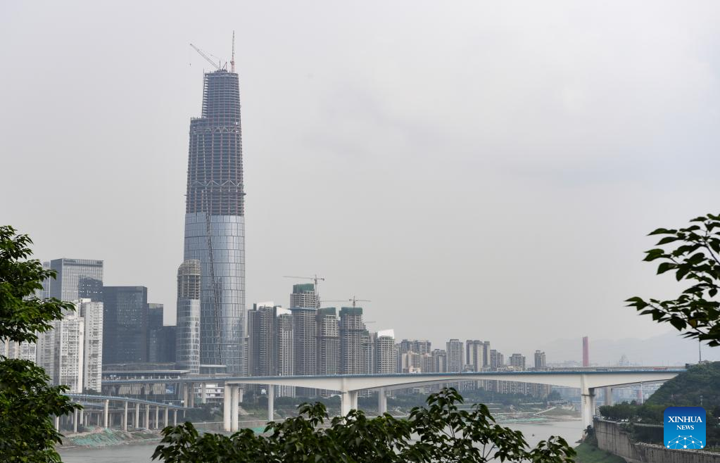 Photo taken on June 17, 2022 shows the international land-sea center in southwest China's Chongqing Municipality. The 458-meter-high main tower of the international land-sea center, a new skyscraper in Chongqing, was topped out on June 18. (Xinhua/Wang Quanchao)