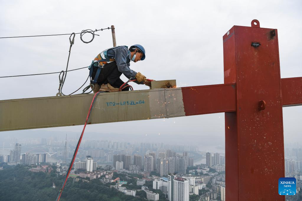 A man works on the main tower of the international land-sea center, also known as Chongqing 100, in southwest China's Chongqing Municipality, June 17, 2022. The 458-meter-high main tower of the international land-sea center, a new skyscraper in Chongqing, was topped out on June 18. (Xinhua/Wang Quanchao)