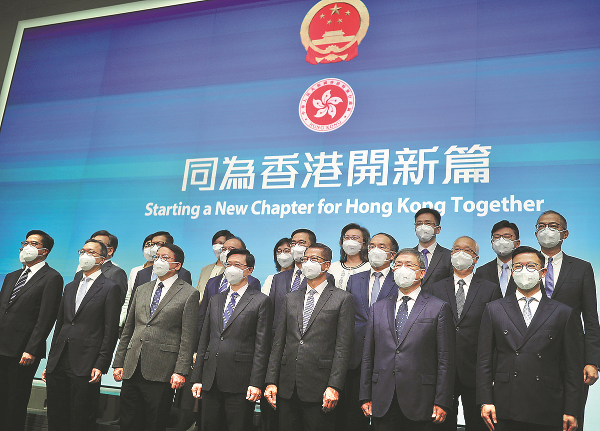 Chief Executive-designate of the Hong Kong Special Administrative Region John Lee Ka-chiu (fourth from left, front) and principal officials of his governing team meet the media in Hong Kong after the State Council approved the nominations of the officials on Sunday. [CALVIN NG/CHINA DAILY]
