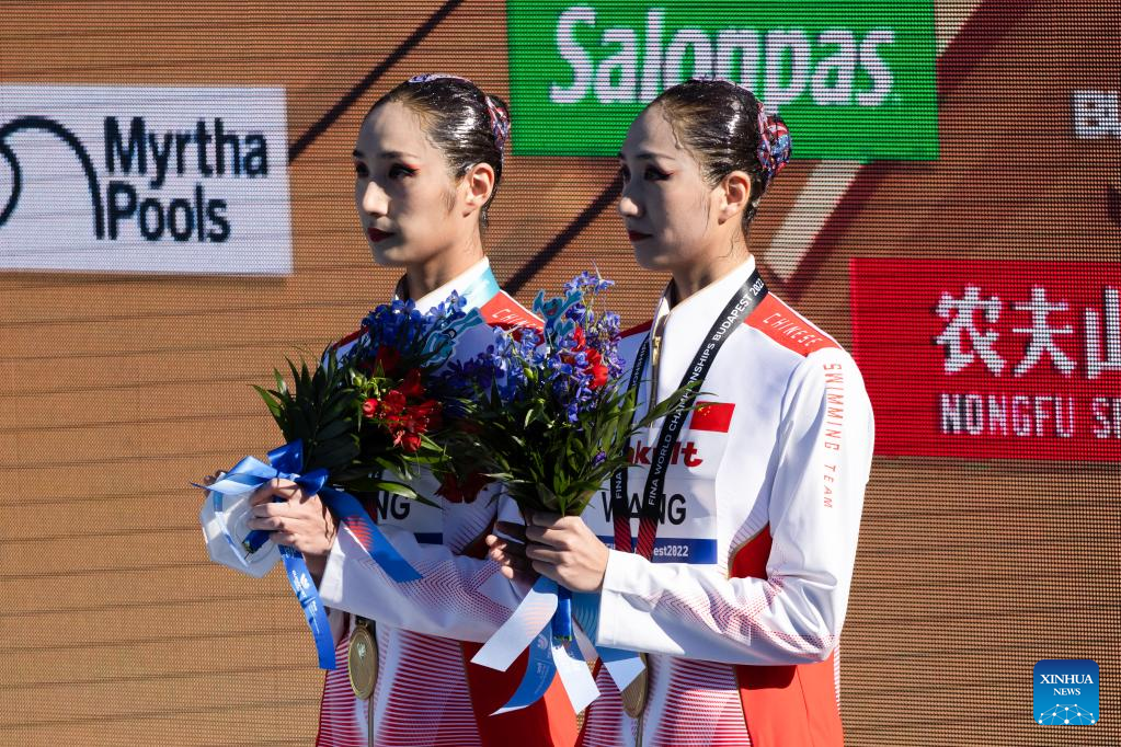 Gold medalists Wang Liuyi and Wang Qianyi of China pose for photos during the awarding ceremony of the Artistic Swimming Women Duet Technical Final at the 19th FINA World Championships in Budapest, Hungary on June 19, 2022. (Photo by Attila Volgyi/Xinhua)