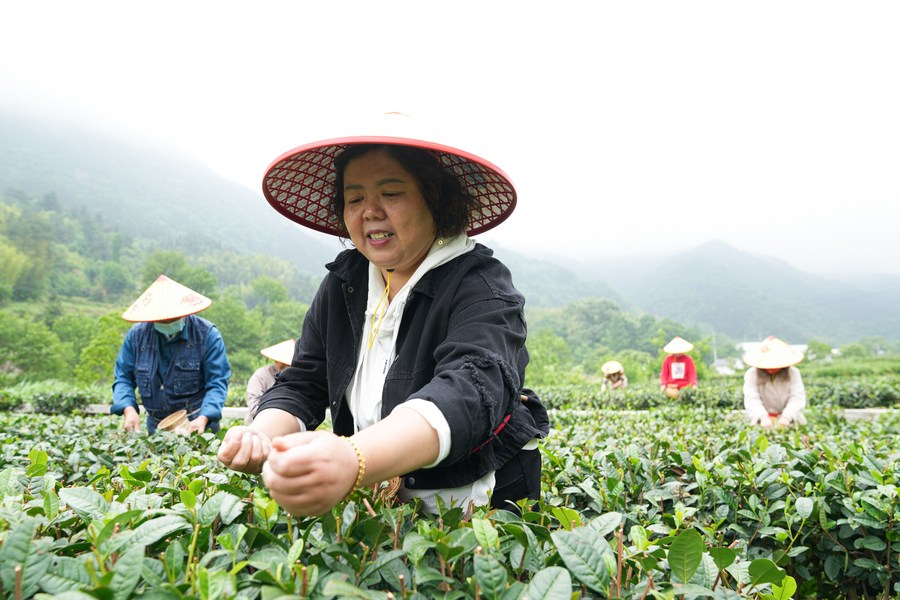 Villagers pick tea leaves at a tea garden in Dawan Village of Jinzhai County, east China's Anhui Province, May 11, 2022. (Xinhua/Du Yu)