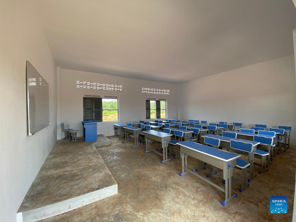 Photo taken on June 18, 2022, shows a classroom of a Chinese-funded school building in the Techo Santepheap Primary School in Oddar Meanchey province, Cambodia. A Chinese-aided school building was inaugurated on Saturday in a remote area here in northwest Cambodia, giving hopes for better education to children in this rural area, officials said. Donated by Chinese-run NGO Cambodia International Charity Organization (CICO), the six-classroom building, along with an office, 10 toilets and a pumping well, is located in the Techo Santepheap Primary School in Dey Thmey Santepheap village of Oddar Meanchey province's Tropang Prasat district. (CICO/Handout via Xinhua)