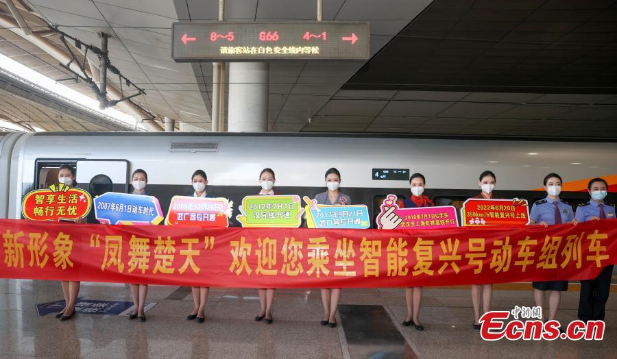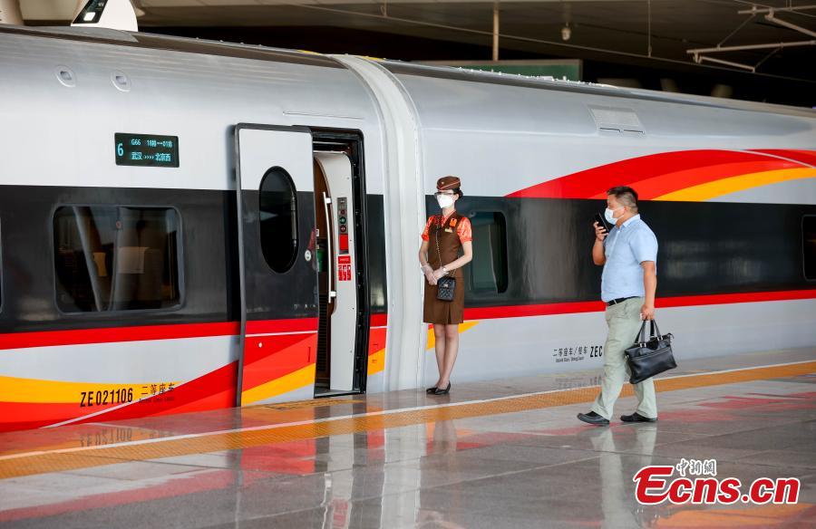 Train attendants welcome passengers on the platform at the Wuhan railway station to Beijing in Wuhan, central China's Hubei Province, June 20, 2022. (Photo: China News Service/Zhang Chang)