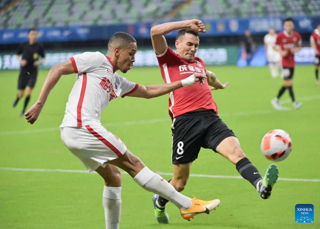 Rodrigo Henrique (L) of Meizhou Hakka shoots past Tim Chow of Chengdu Rongcheng during their 2022 season Chinese Football Association Super League (CSL) match in Meizhou, south China's Guangdong Province, June 20, 2022. (Xinhua/Chen Xinbo)