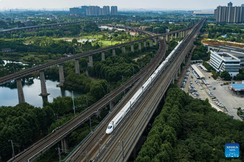 Aerial photo shows a high-speed train running on the Beijing-Wuhan section of the Beijing-Guangzhou High-speed Railway, in Wuhan, central China's Hubei Province, June 20, 2022.(Xinhua/Xiao Yijiu)
