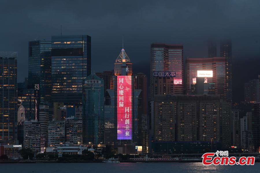 A light show is staged at the Victoria Harbor to celebrate the 25th anniversary of Hong Kong's return to the motherland in the Hong Kong Special Administrative Region(HKSAR), June 20, 2022. (Photo: China News Service/Li Zhihua)