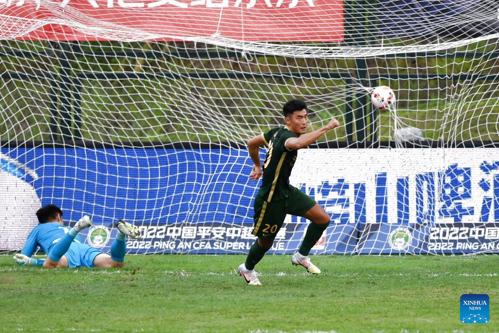 Wang Ziming (R) of Beijing Guoan celebrates after scoring during a 2022 season Chinese Football Association Super League (CSL) match between Beijing Guoan and Shenzhen FC in Meizhou, south China's Guangdong Province, June 21, 2022. (Xinhua/Chen Zhenhai)