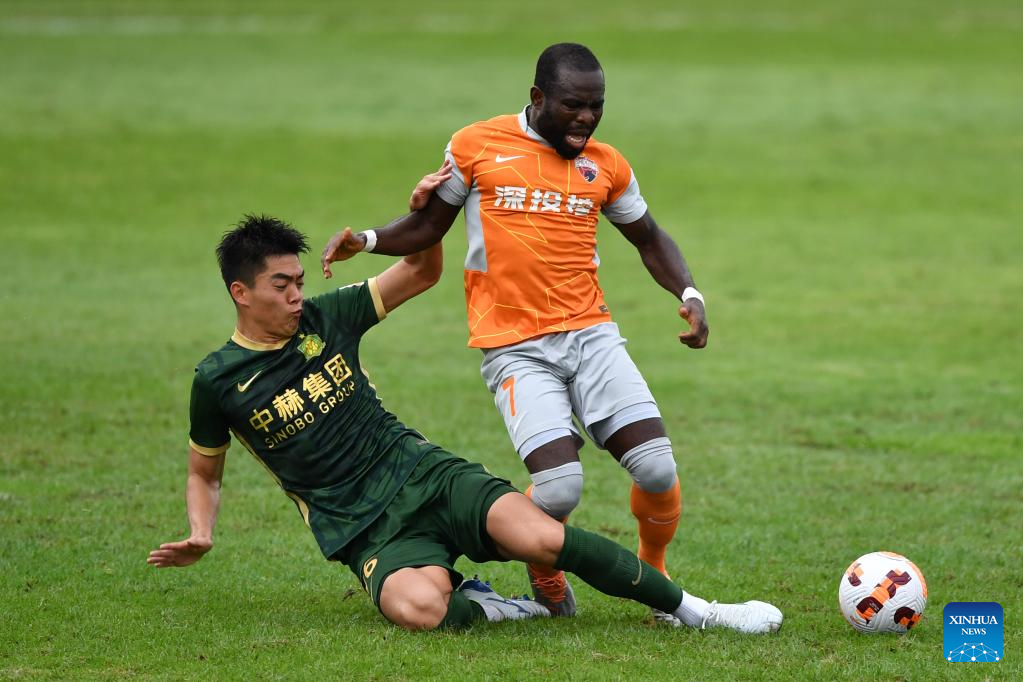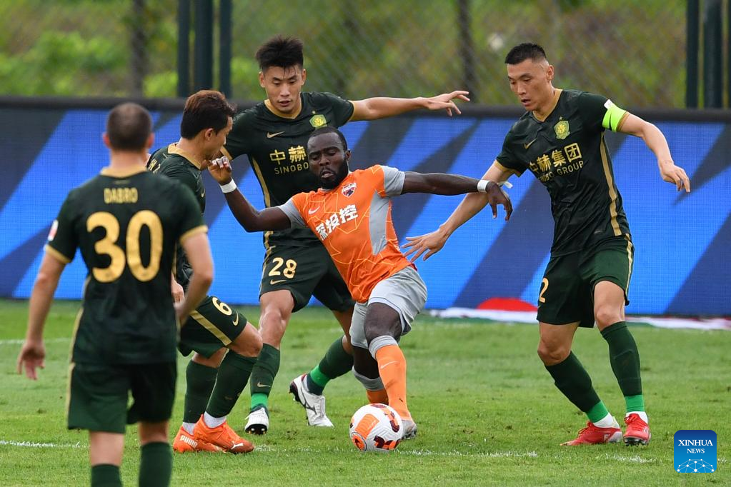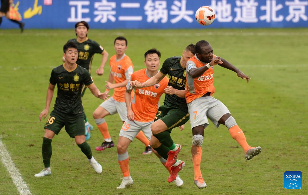 Frank Acheampong (2nd R) of Shenzhen FC vies for the ball during a 2022 season Chinese Football Association Super League (CSL) match between Beijing Guoan and Shenzhen FC in Meizhou, south China's Guangdong Province, June 21, 2022. (Xinhua/Chen Zhenhai)