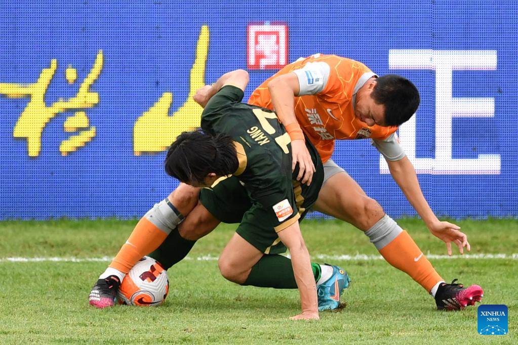 Kang Sang-Woo (L) of Beijing Guoan vies with Sun Ke of Shenzhen FC during their 2022 season Chinese Football Association Super League (CSL) match in Meizhou, south China's Guangdong Province, June 21, 2022. (Xinhua/Chen Zhenhai)