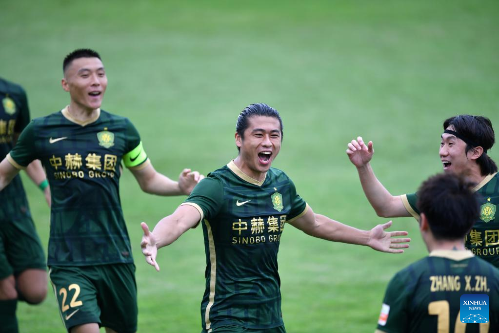 Zhang Yuning (C) of Beijing Guoan celebrates after scoring during a 2022 season Chinese Football Association Super League (CSL) match between Beijing Guoan and Shenzhen FC in Meizhou, south China's Guangdong Province, June 21, 2022. (Xinhua/Chen Zhenhai)