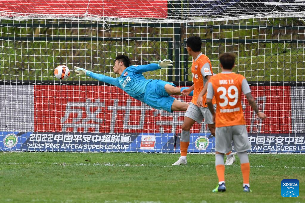 Zhang Lu (L), goalkeeper of Shenzhen FC, makes a save during a 2022 season Chinese Football Association Super League (CSL) match between Beijing Guoan and Shenzhen FC in Meizhou, south China's Guangdong Province, June 21, 2022. (Xinhua/Chen Zhenhai)