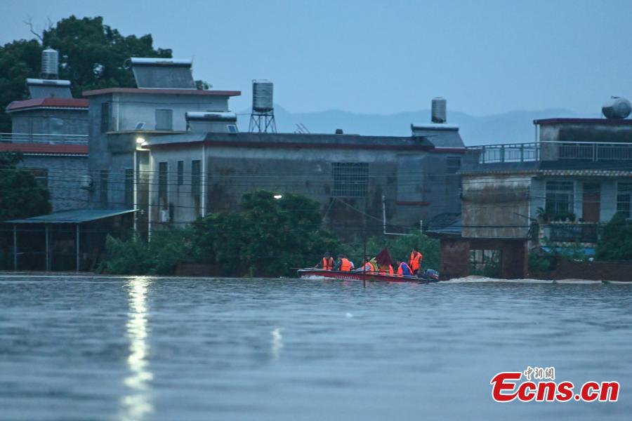 Rescue personnel evacuate trapped people during a major flood in Shaoguan, south China's Guangdong Province, June 21, 2022. (Photo: China News Service/Chen Jimin)