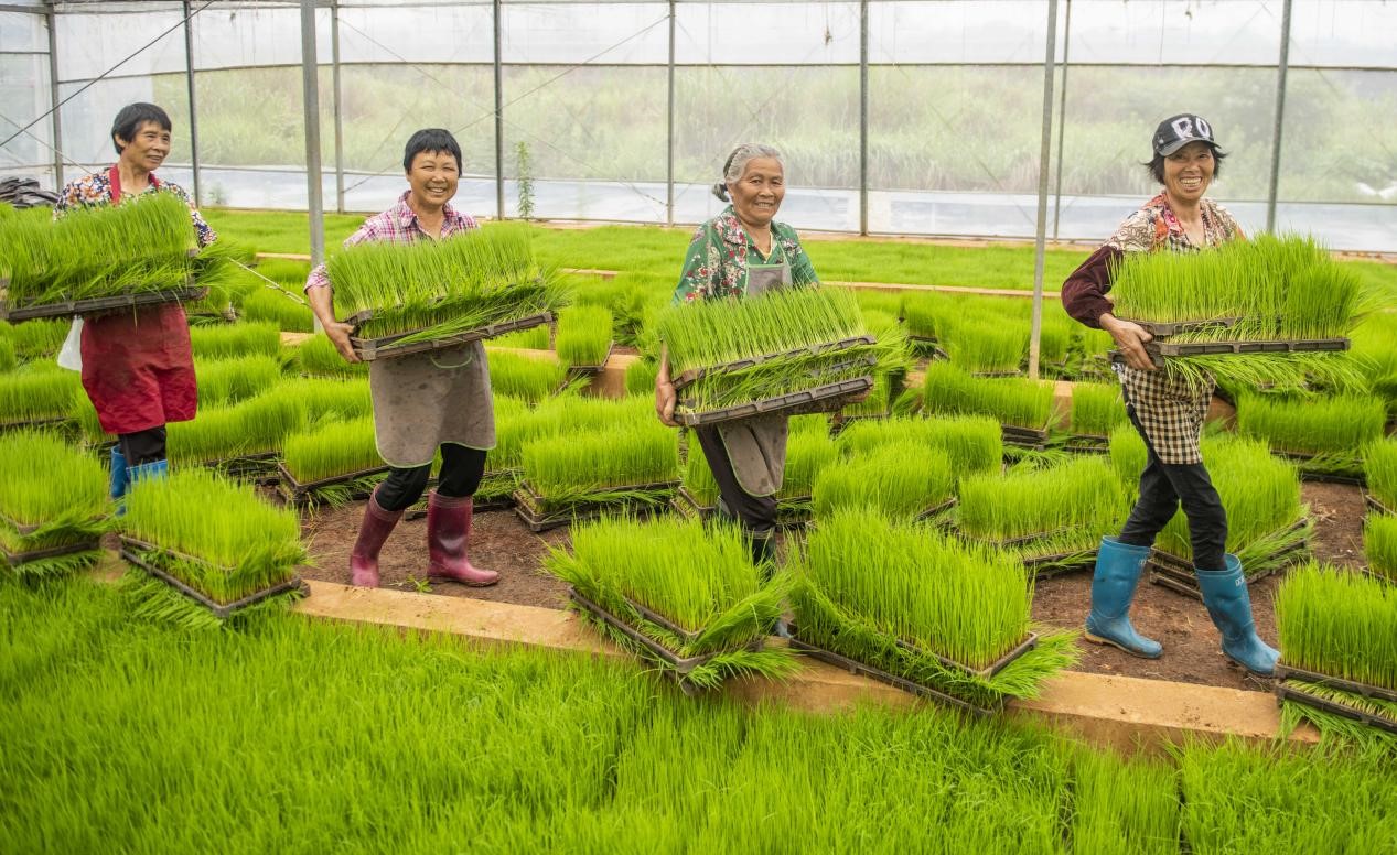 Farmers carry middle-season rice seedlings at a seedling cultivation base of an agricultural machinery cooperative in Baishizhai village, Yongzhou city, central China’s Hunan province, June 6, 2022. (People’s Daily Online/ Jiang Keqing)