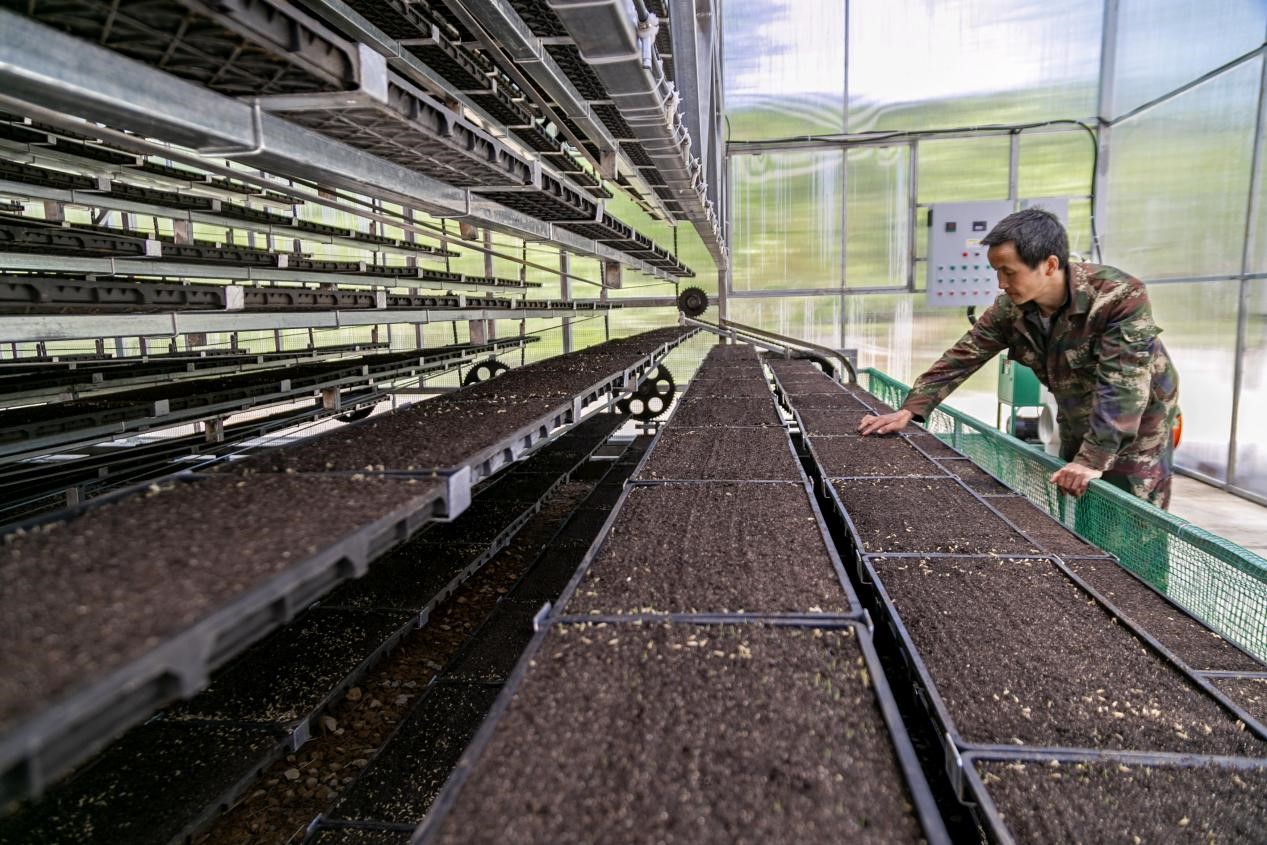 A technician works at a rice seedling cultivation factory of an agricultural machinery cooperative in Tongdao Dong autonomous county, Huaihua city, central China’s Hunan province, April 19, 2022. (People’s Daily Online/ Yin Xuping)