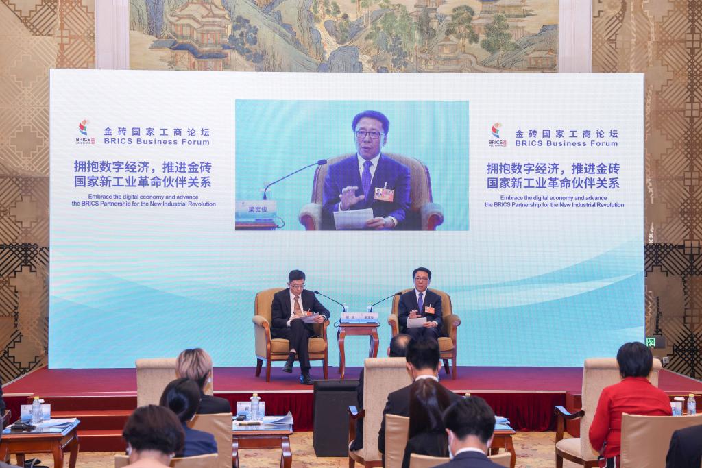 A panel discussion themed "Embrace the digital economy and advance the BRICS Partnership for the New Industrial Revolution" is held during the BRICS Business Forum in Beijing, capital of China, June 22, 2022. (Xinhua/Yin Gang)