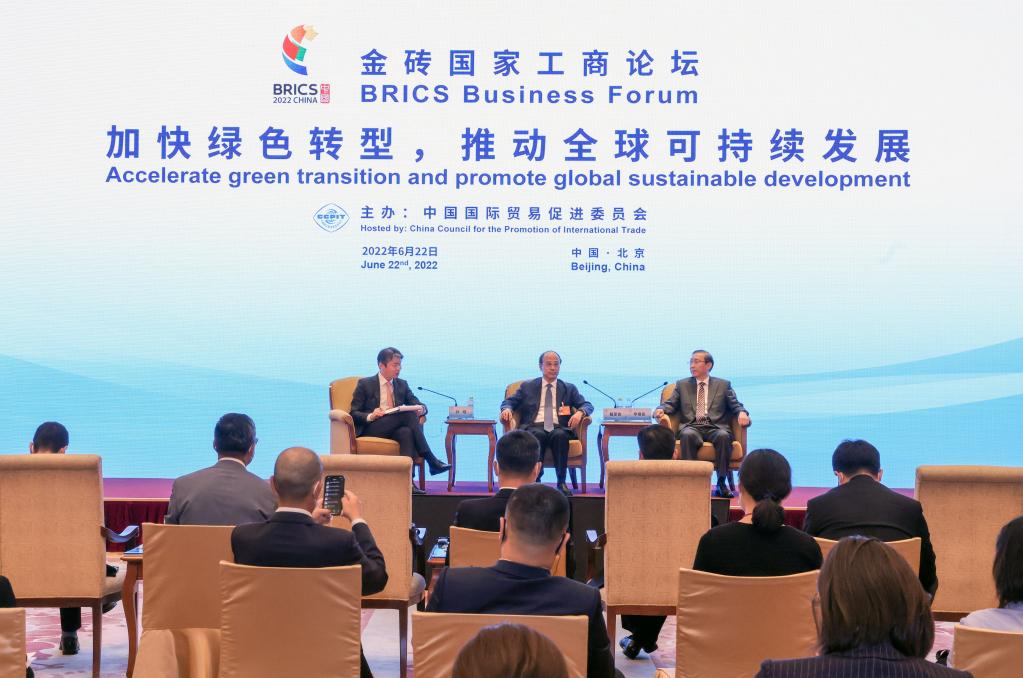 A panel discussion themed "Accelerate green transition and promote global sustainable development" is held during the BRICS Business Forum in Beijing, capital of China, June 22, 2022. (Xinhua/Yin Gang)