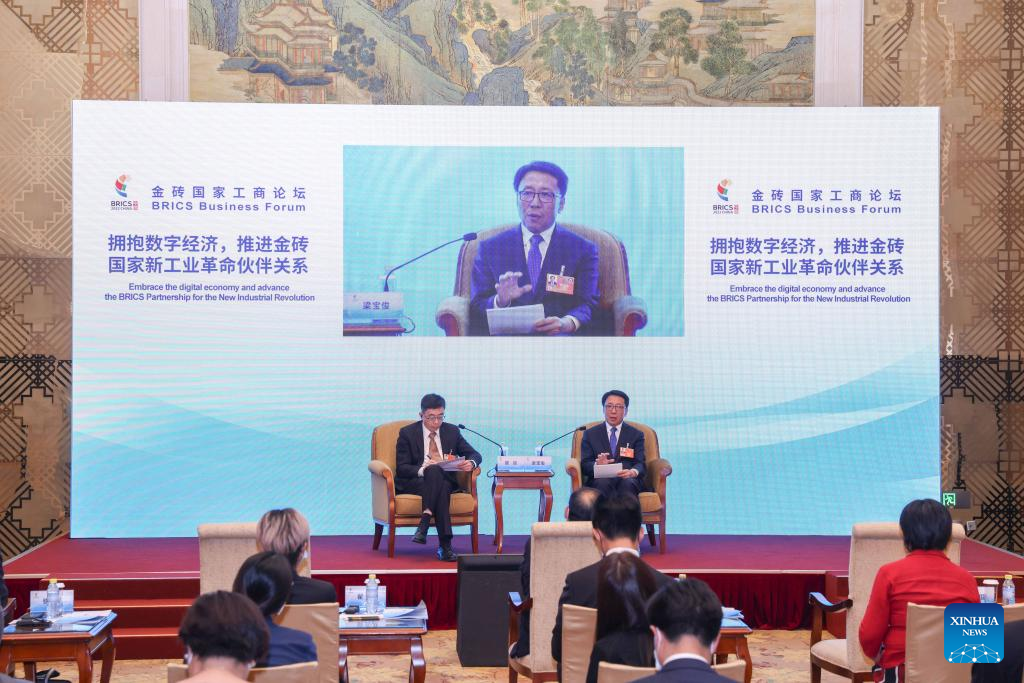 A panel discussion themed "Embrace the digital economy and advance the BRICS Partnership for the New Industrial Revolution" is held during the BRICS Business Forum in Beijing, capital of China, June 22, 2022. (Xinhua/Yin Gang)