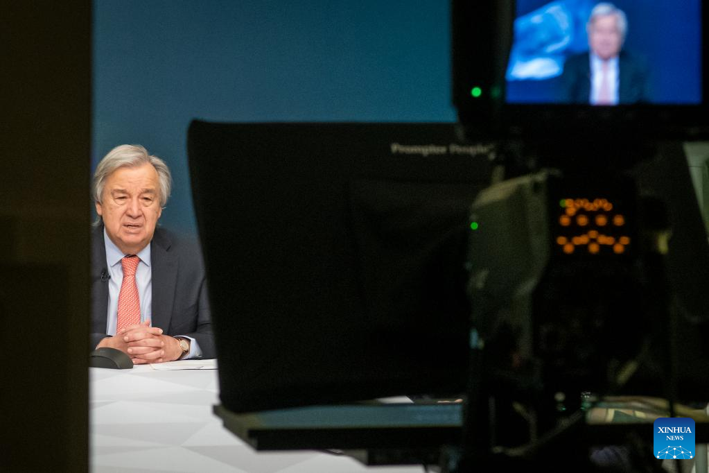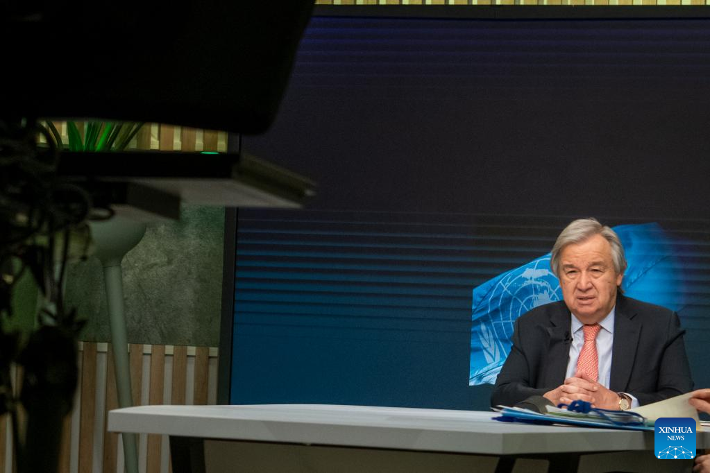 UN Secretary-General Antonio Guterres speaks during a virtual memorial service at the UN headquarters in New York, on June 22, 2022. Guterres on Wednesday paid tribute to the 485 UN personnel who lost their lives in the line of duty last year. (Mark Garten/UN Photo/Handout via Xinhua)